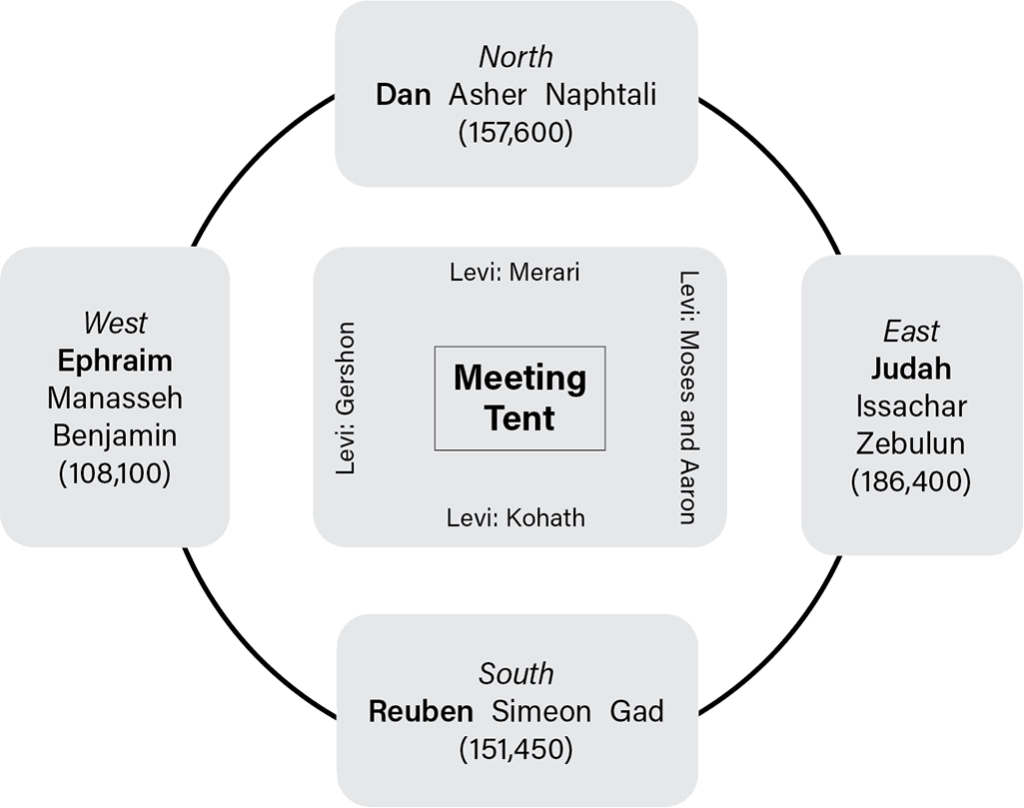 There are two ways to interpret Num. 2:17: (1) the sanctuary and not the king is to be the center of Israel’s society; or (2) in light of the glory of Yahweh that fills and appears from the meeting tent, Yahweh is the king who has taken up residence in the center of his people’s military encampment. Either way, if Yahweh not only possesses Israel as his people (Lev. 20:26) but also created the heavens and earth (Exod. 19:5; 20:11; 31:17), then wherever he pitches his tent becomes the axis mundi (axis of the world), a continuum that extends from heaven through earth and into the abyss below. When encountered in history or grasped by faith, the presence of Yahweh in time and space reorients everything.
